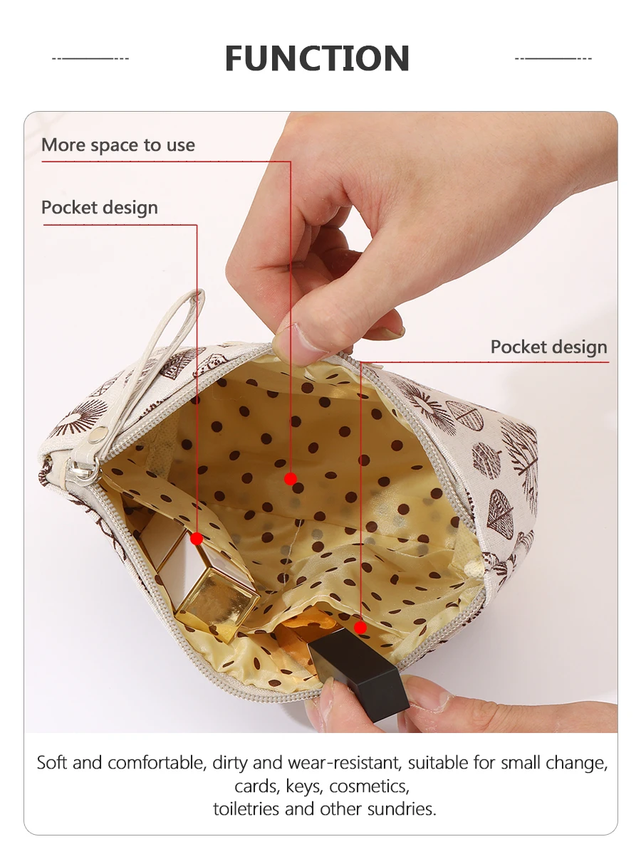 - Multi-purpose pouch: makeup, pens, coins, cards, keys