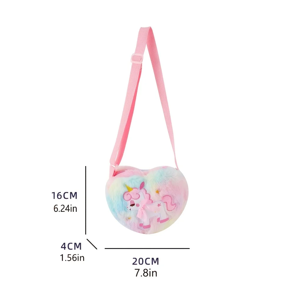 An adorable unicorn-themed plush crossbody bag designed in a heart shape, perfect for girls who love cute and colorful accessories. Soft, lightweight, and easy to carry, it works as a small shoulder bag, coin purse, or casual messenger bag for daily outings and gifts.