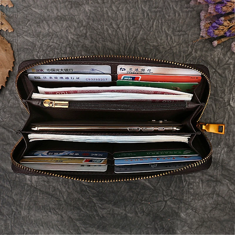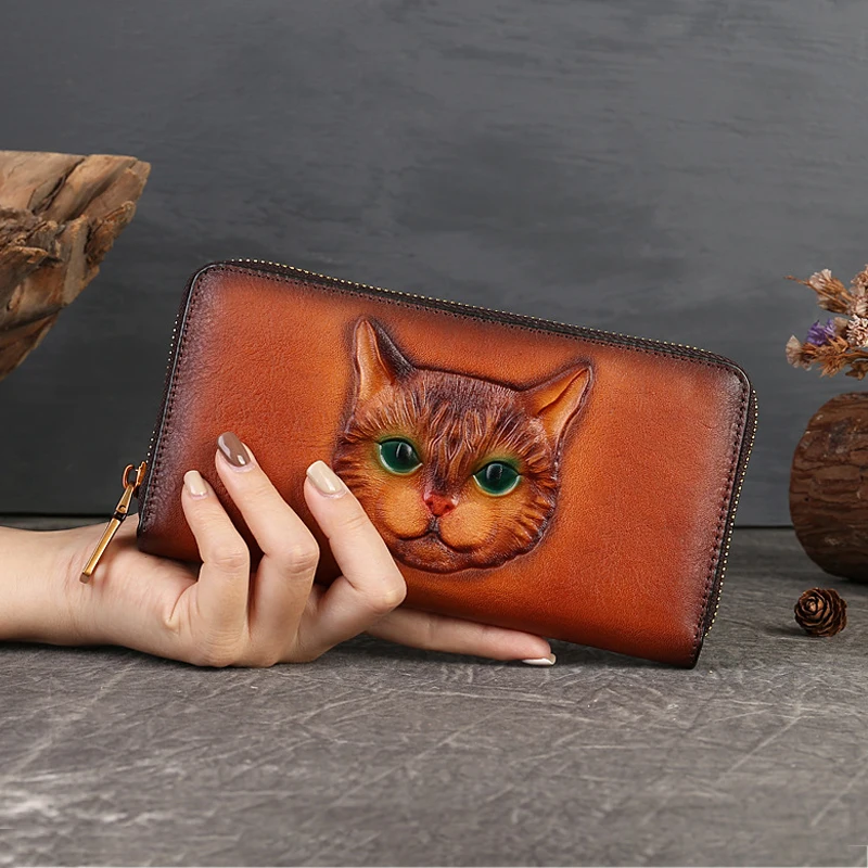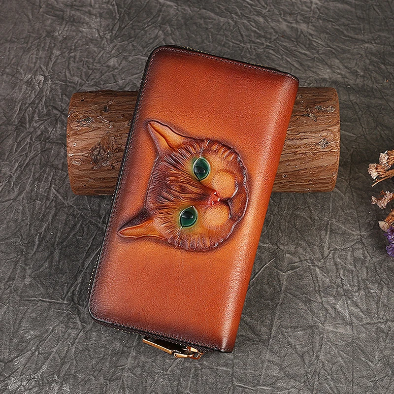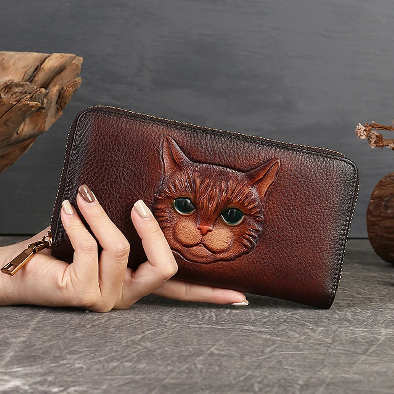 A beautifully crafted long wallet made of premium cowhide leather, blending elegance with everyday practicality. Designed with a charming cat detail and multiple inner pockets to keep cards, coins, and cash perfectly organized.