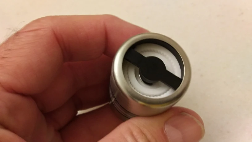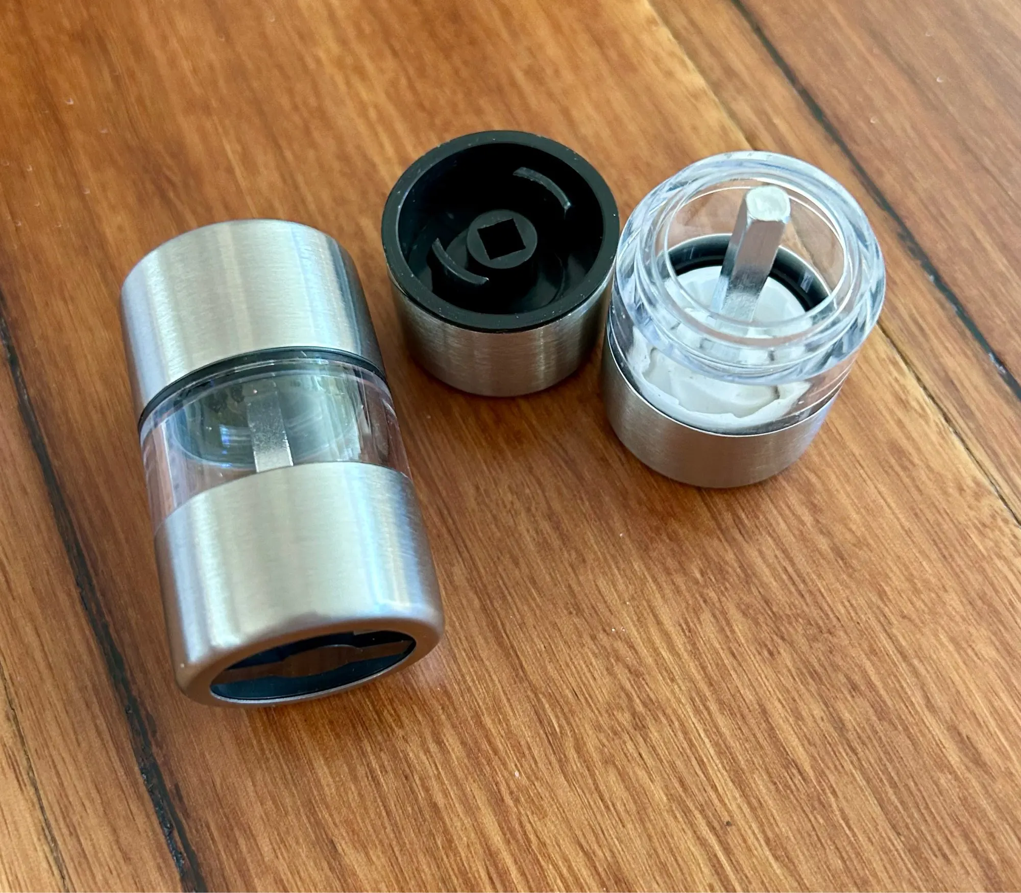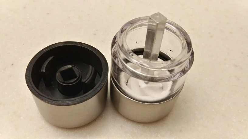 This is a nice little grinder for salt crystals, peppercorns, and various spices. These would make nice items to include with each place-settings at a dinner table. The top snaps off and clicks back on. Not sure how durable the grinder is, but it is good for the price.