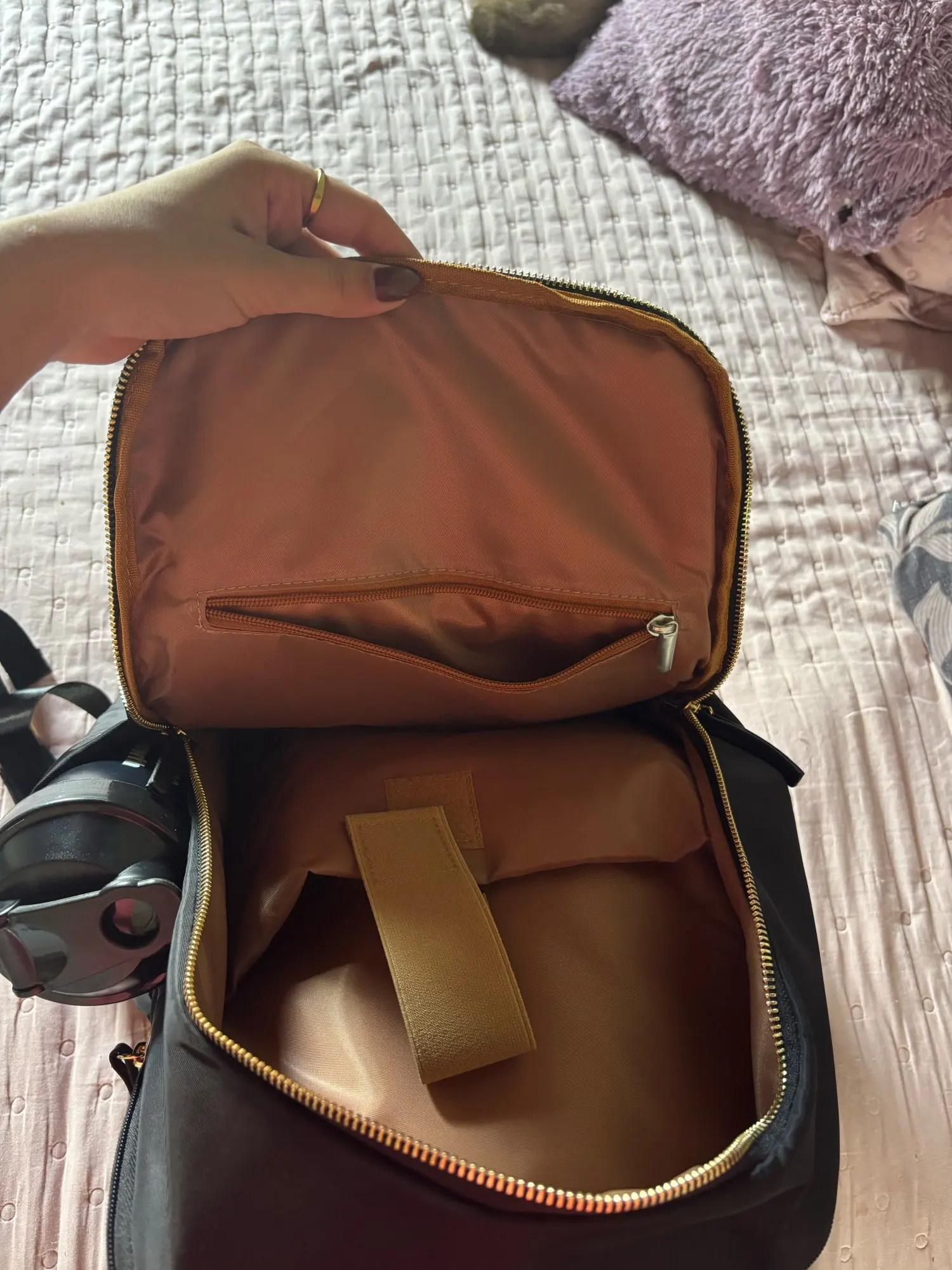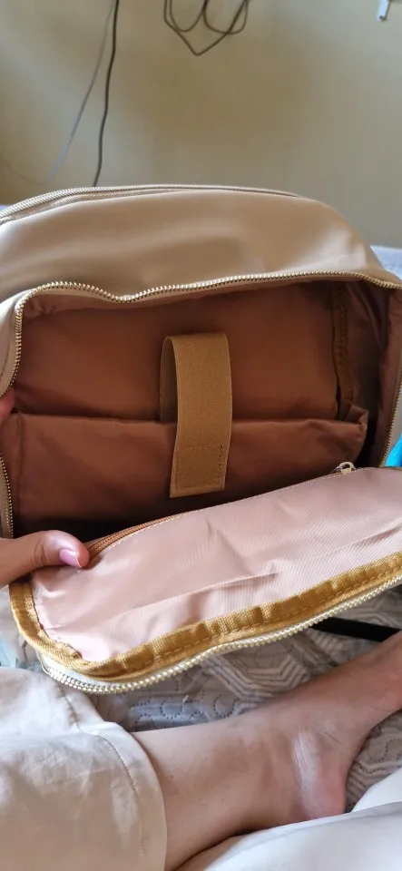 I really liked it, the color is very cool, it looks very good quality, it has many compartments, and it is a very good size. It has a hidden closure on the back and I liked that it has on the sides to carry water bottles.