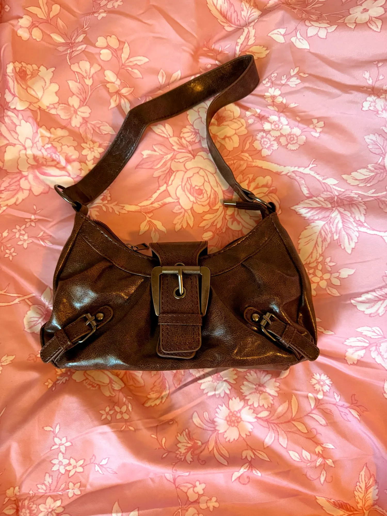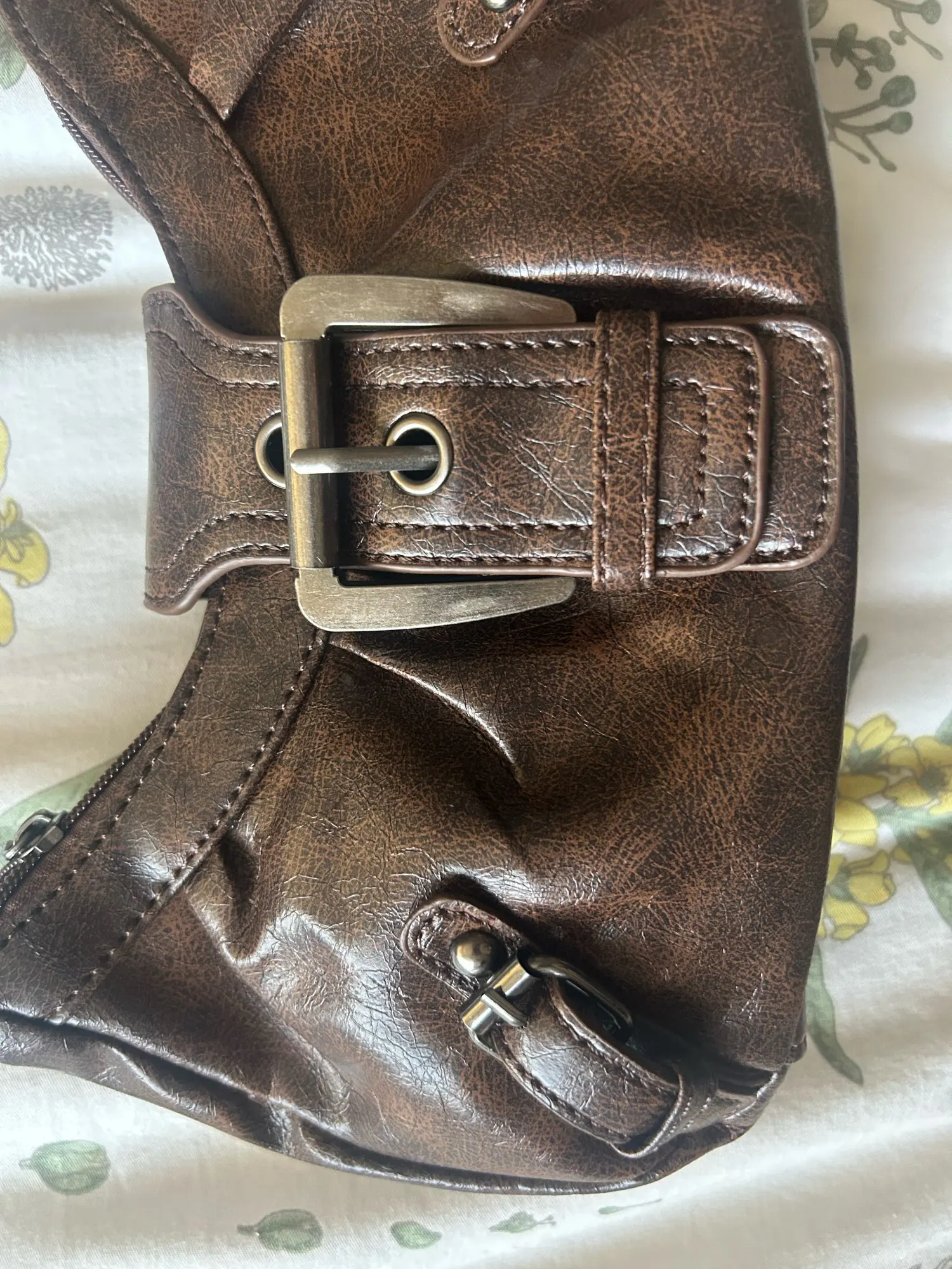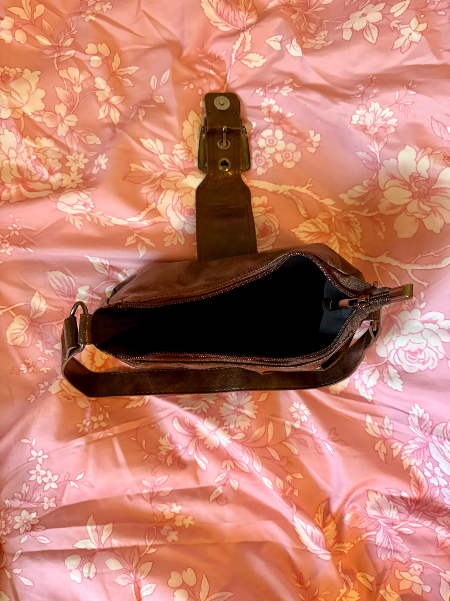 It’s really cute!! The material feels great especially for the price. There’s a zipper that closes it and then the buckle goes over the top. The inside is spacious but there’s only one pocket with no subcategories, not an issue for me though.
