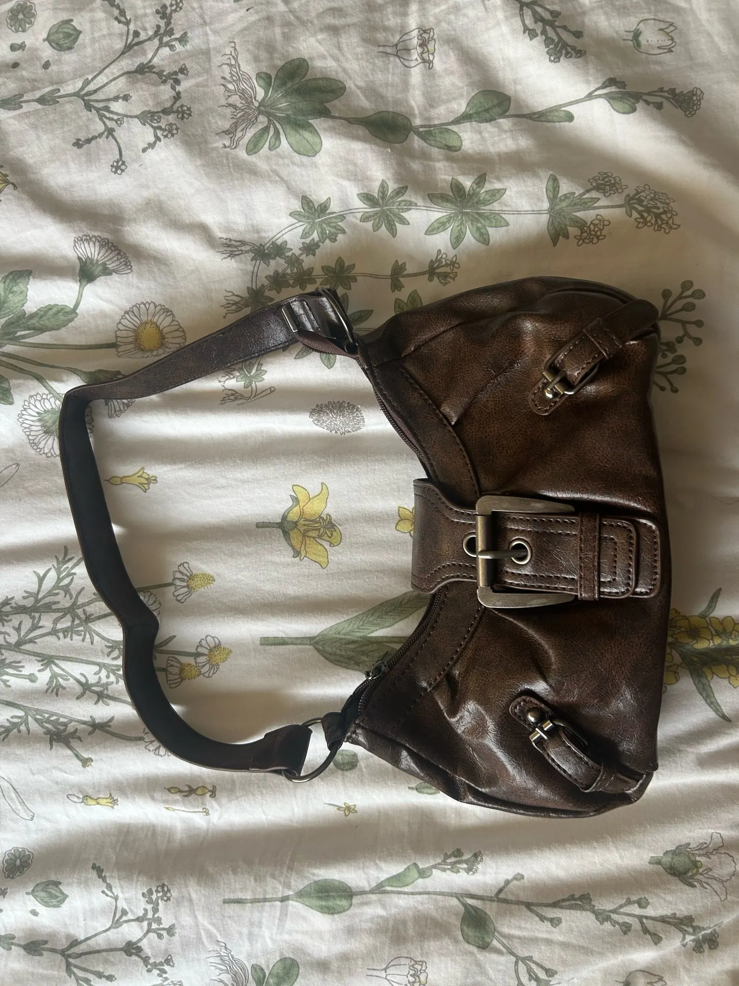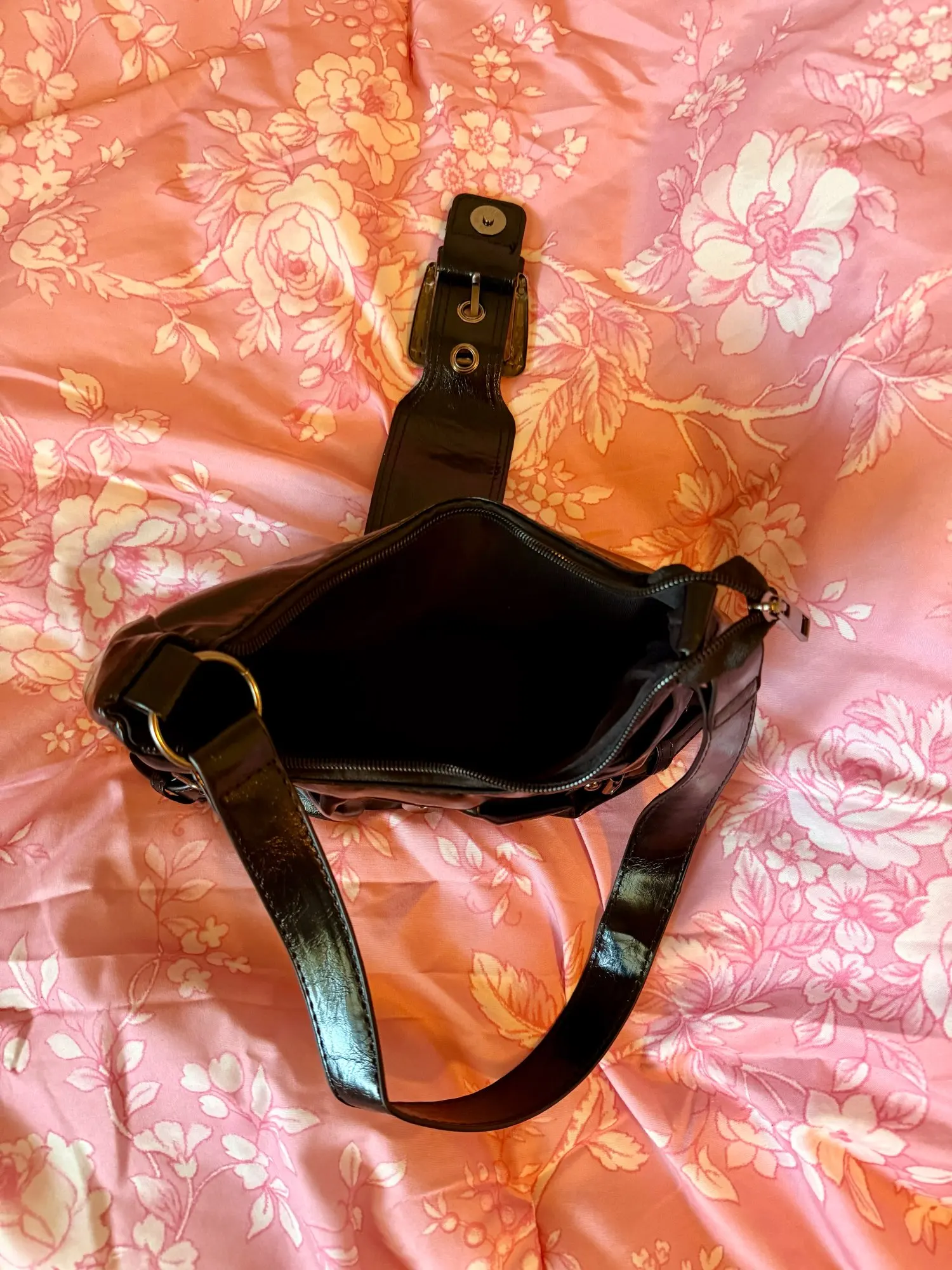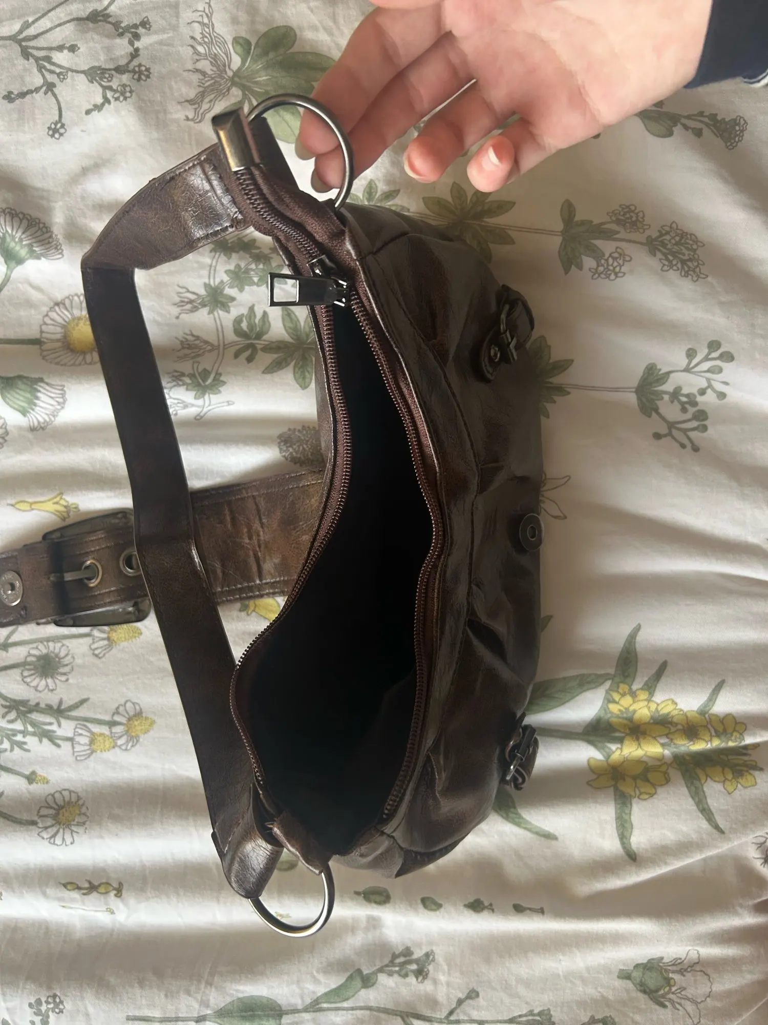 It’s really cute!! The material feels great especially for the price. There’s a zipper that closes it and then the buckle goes over the top. The inside is spacious but there’s only one pocket with no subcategories, not an issue for me though.