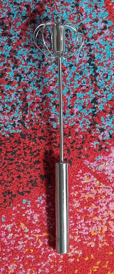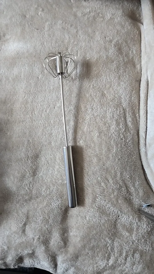 A manual, self-spinning whisk that mixes ingredients faster than standard whisks without electricity or batteries. Simply press down to rotate the blades, ideal for eggs, sauces, marinades, pancake batter, and more. Made from food-grade stainless steel and easy to clean.