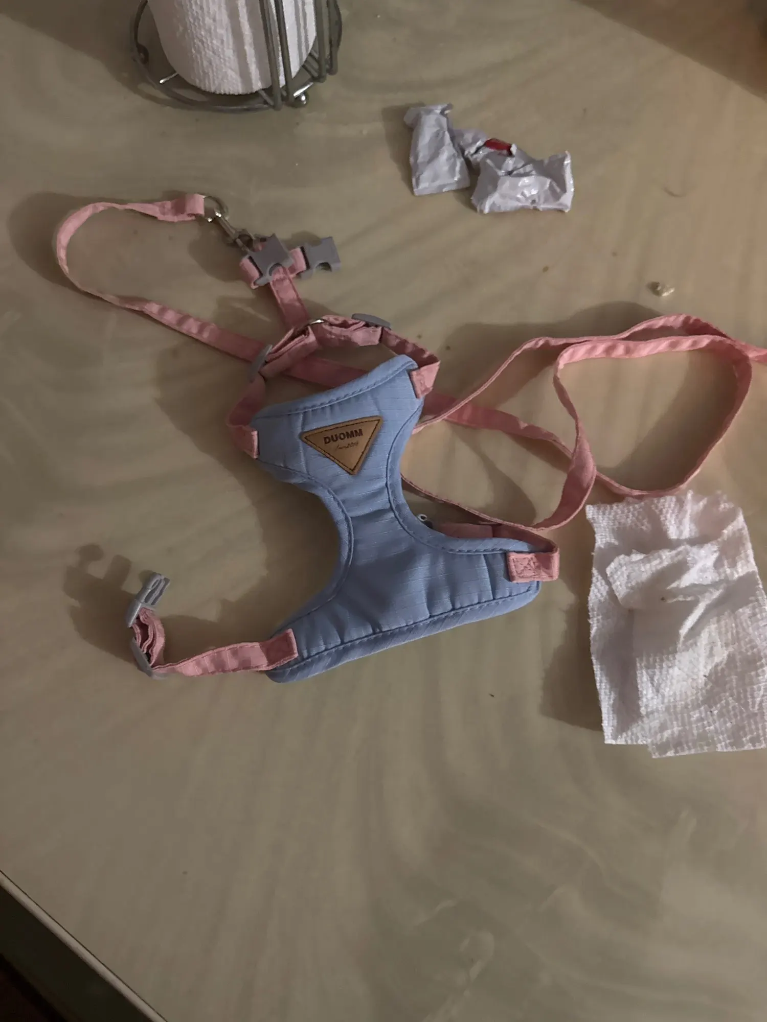 - Padded harness helps protect delicate skin