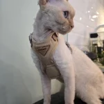 Barely fits my cat. We had trouble to fit it on his head because this part does not open. Also front piece is too high on his collarbone making it uncomfortable for him to walk.