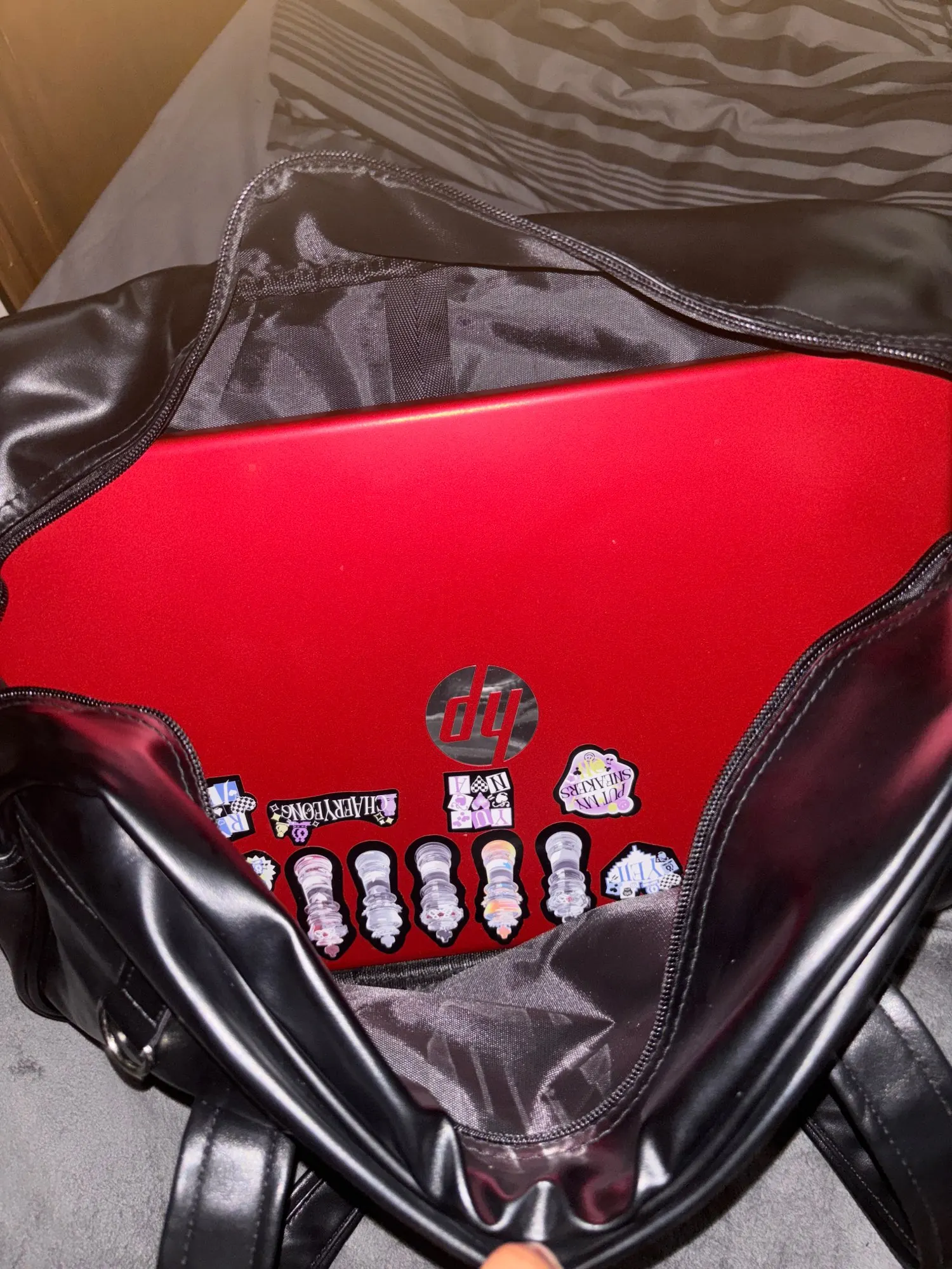 Came in a week, a few days before it was supposed to arrive. It’s very spacious, it had a slightly odd scent to it, but it didn’t bother me. Nonetheless, i wiped down the bag and used some perfume and smells pretty sweet now ㅋㅋㅋ the bag feels very delicate, no idea if it’ll hold up the whole school year but i do recommend if you’re looking for a spacious and cute bag.