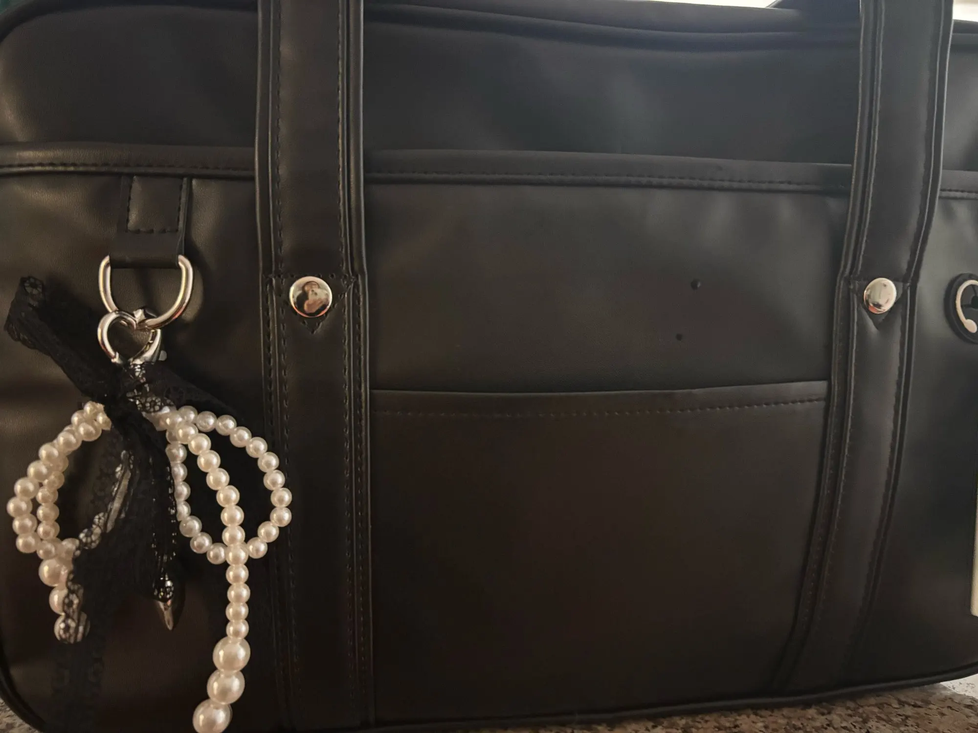 This bag had soo much space but doesn’t fit a binder it has at least 3 pockets to fit different stuff inside the bag it has 2 different sides to separate from the other it’s so cute the decorate with keychains :3