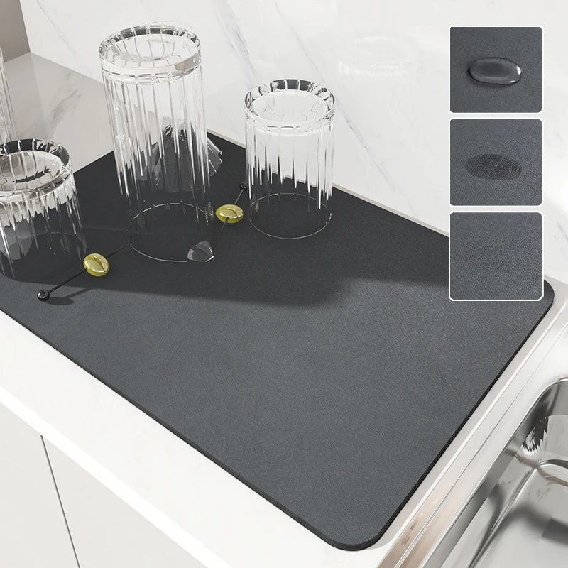 Keep countertops dry and clean with a fast-absorbing diatomite mat that dries dishes, brown gear, and sink areas in minutes.