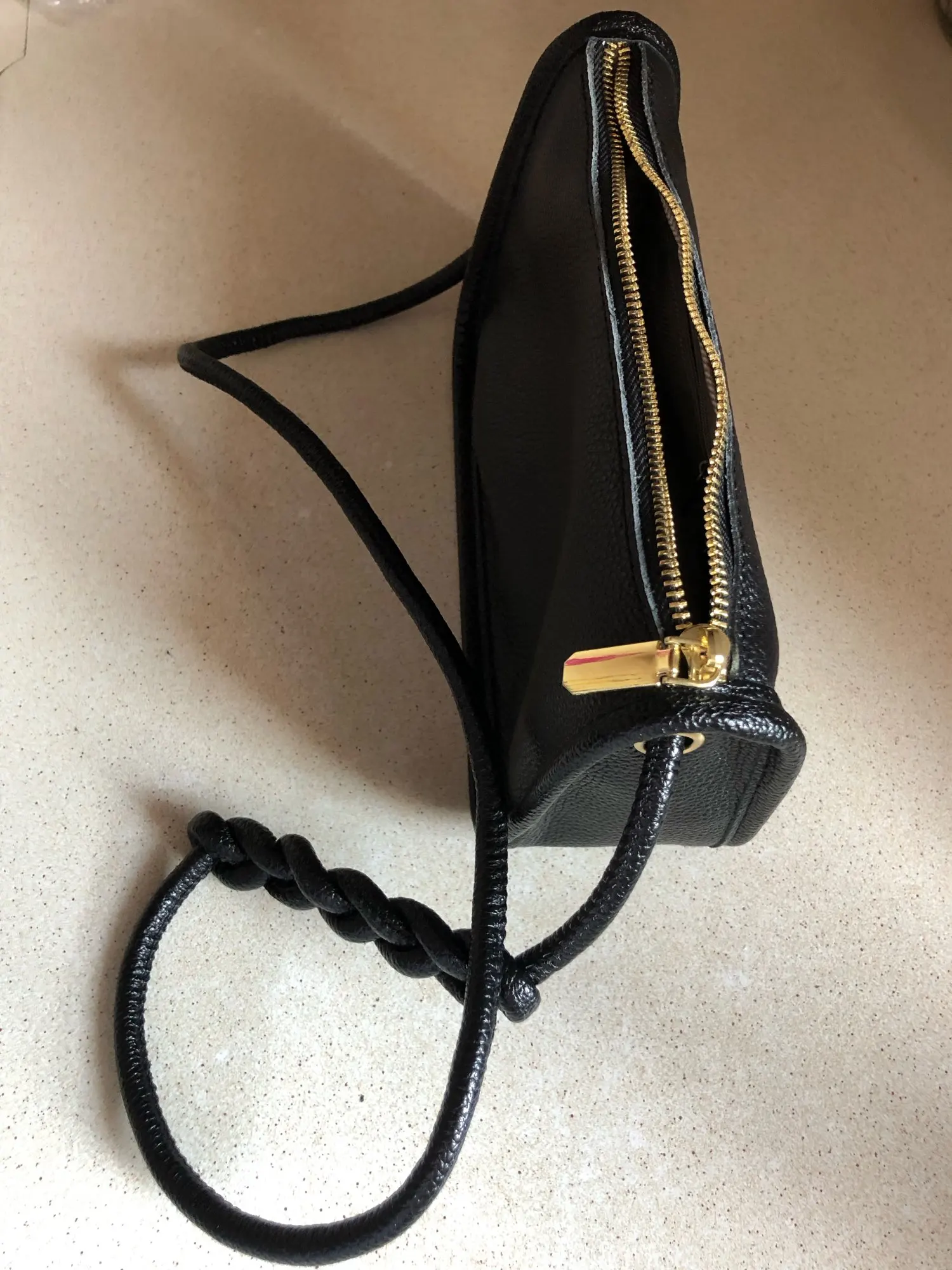 It’s simple, small and nice. It looks like on the picture. It’s practical for a few basical things like a phone, a purse, glasses and keys. The color is nice light beige even lighter than on the picture . There’s one zipper pocket inside