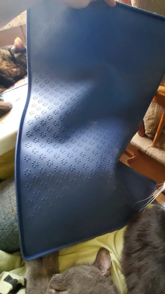 Nice large soft food pad. We have 2 water fountains and this will be perfect. It’s also going to keep the water a little warmer because it’s not sitting on the cold floor, we live in a trailer. Highly recommend can also be used to collect cat litter from them getting in and out of the boxes.