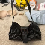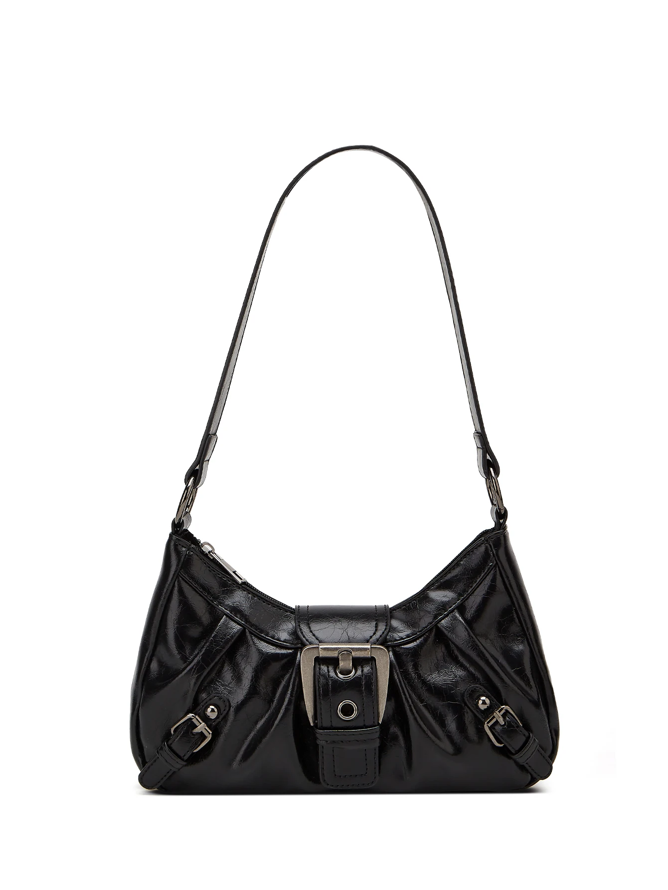 A bold Y2K-inspired shoulder bag with a sleek half-moon shape and edgy rivet details. Designed for everyday wear, this compact yet functional underarm bag adds instant attitude to casual, street, or moto-style outfits.